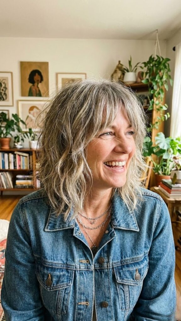This length is a sweet spot. It’s not too short and not dragging you down. The loose waves feel relaxed, like you didn’t try too hard. Face-framing bangs soften everything and shave years off your look.